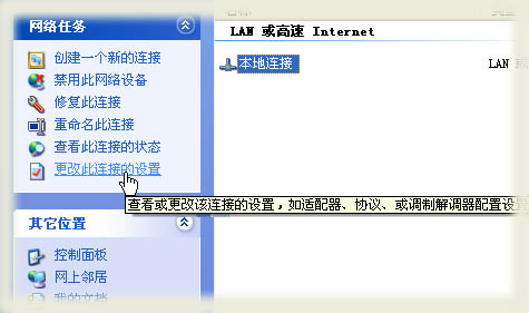 4. 在左侧的任务窗格中,在“网络任务”下单击“更改此连接的设置”。(快捷的操作方式是,您可以右键单击要保护的连接,然后单击“属性”。)
