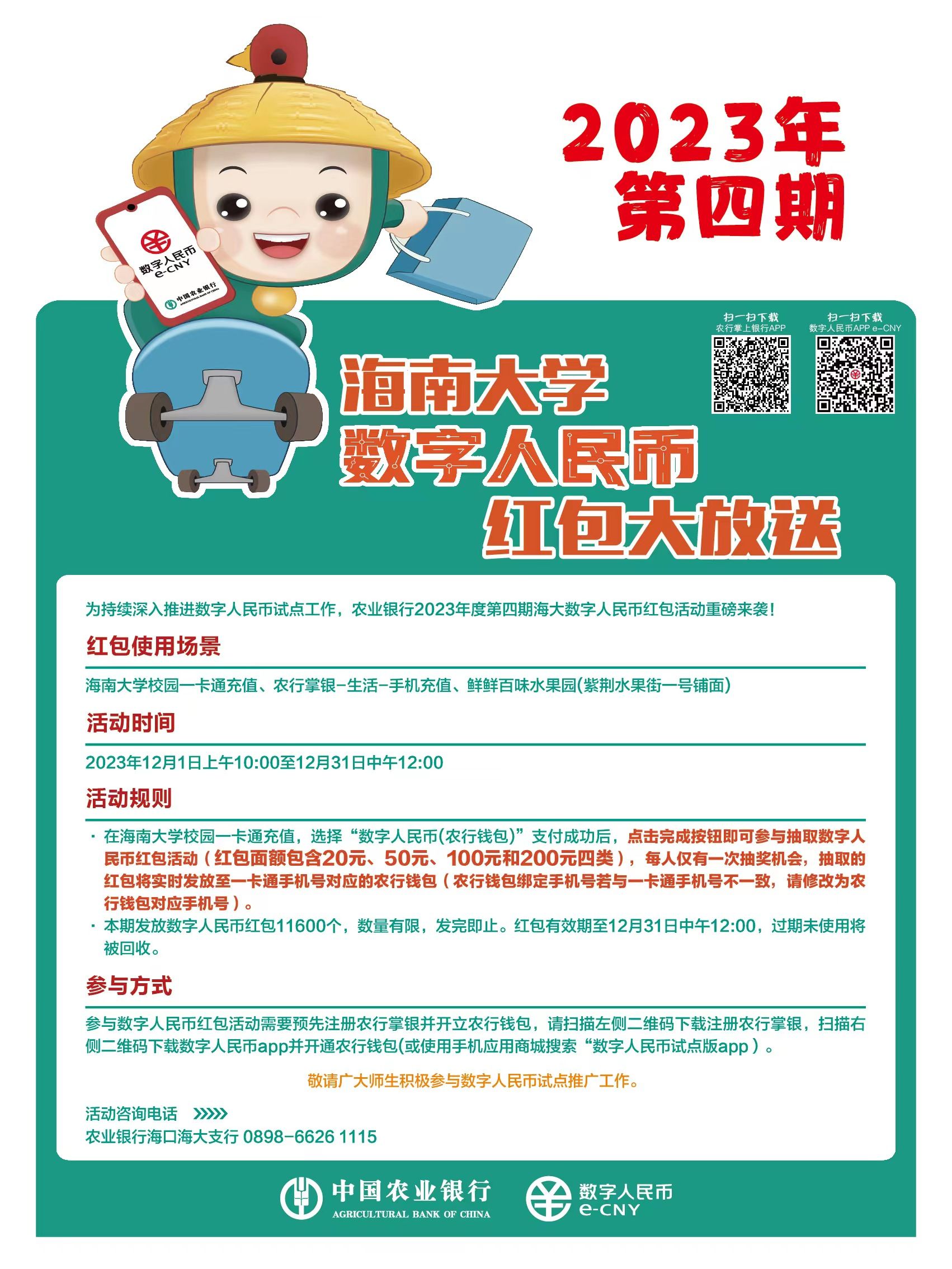 为持续深入推进数字人民币试点工作,农业银行2023年度第四期海大数字人民币红包活动重磅来袭!