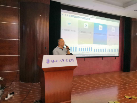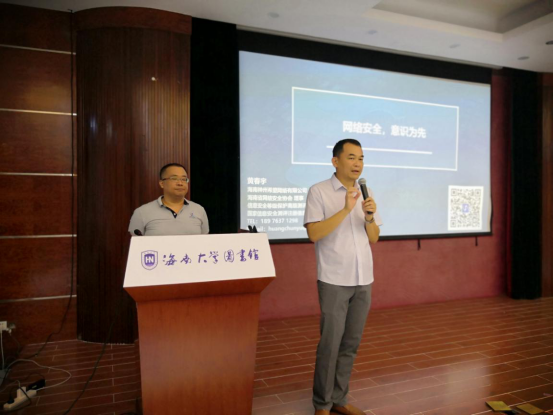 9月19日晚,信息化服务中心在图书馆五楼报告厅举办了主题为“网络安全,意识为先”(暨图书馆湖畔讲坛第126期)讲座。讲座邀了海南神州希望网络有限公司设计总监、海南省网络安全协会理事、高级测评师黄春宇与渗透测试工程师、OWASP中国海南区域负责人王强共同主讲。讲座针对目前网络安全的严峻形势进行分析与思考、以及对《网络安全法》进行解读,通过对法规的解读及案例分析,强调网络安全对国家和个人的重要性,并提出有效的防范措施和方法。讲座过程中还进行了手机攻防的现场演示,通过互动增强了师生的网络安全意识。