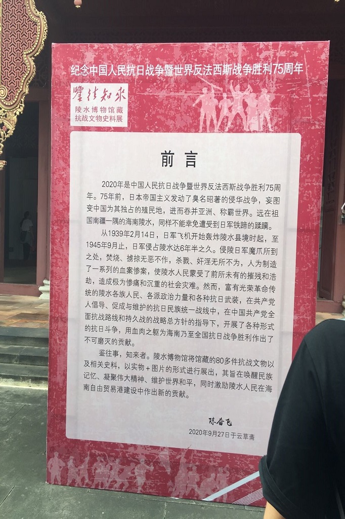 2020年是中国人民抗日战争暨世界反法西斯战争胜利75周年,陵水县苏维埃农民协会旧址正在展出抗战文物以及相关史料。