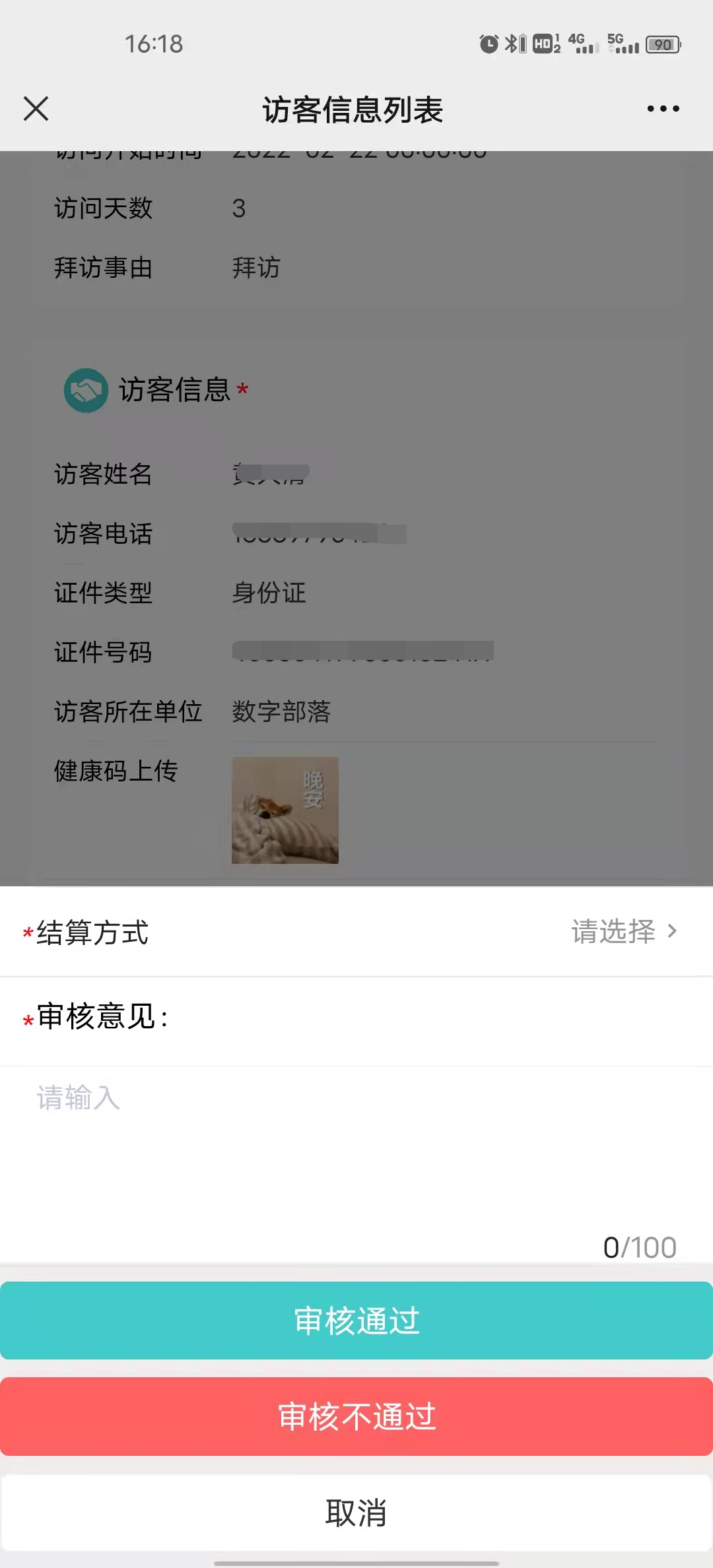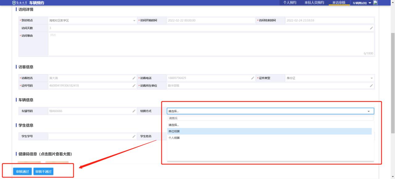 4.点击需要审核的信息卡片,进入审核界面,校验完预约信息的合格性后,可进行审核通过和不通过,如果有随行车辆,那么需要选择结算方式。