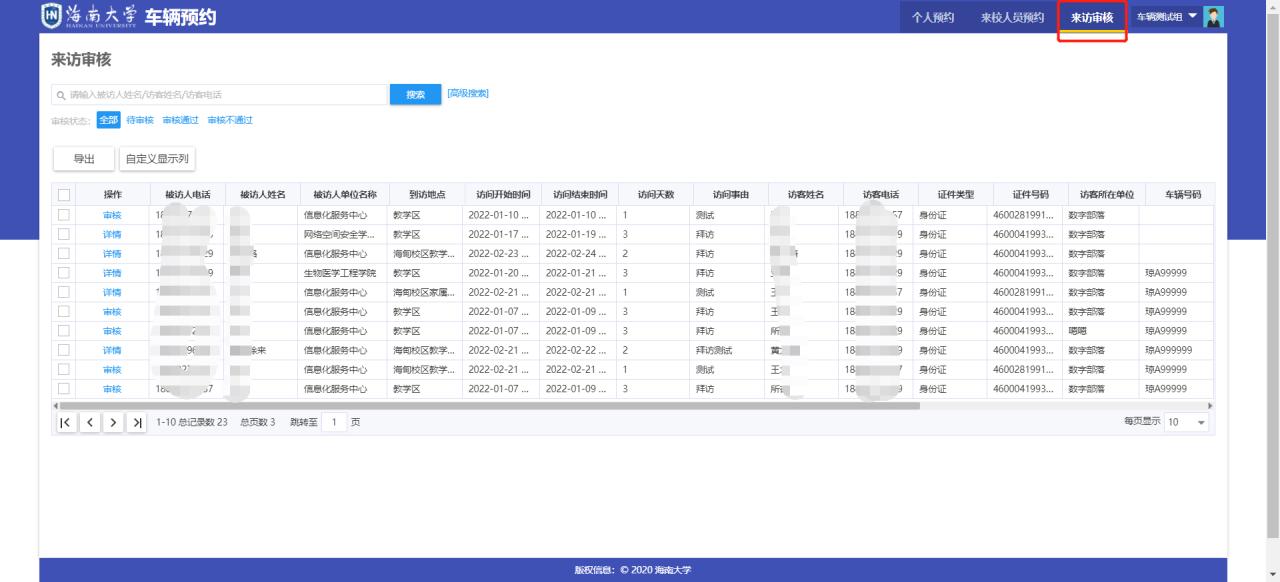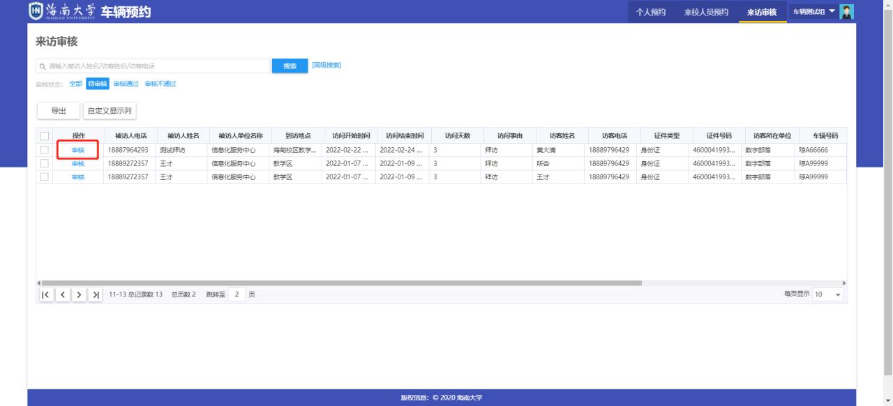 1.拥有审核权限的教职工可以审核本部门的预约,可从PC端或者移动端进行预约,PC端可在网上服务大厅搜索“进校预约“应用,进入应用后,可选择“来访审核”菜单,进入审核列表页进行审核。