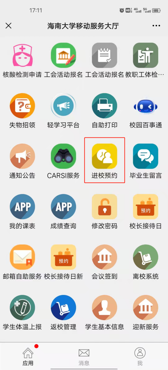 3.企业微信端进行审核,需要从企业微信进入移动服务大厅,选择进校预约应用,进入应用进行审核。