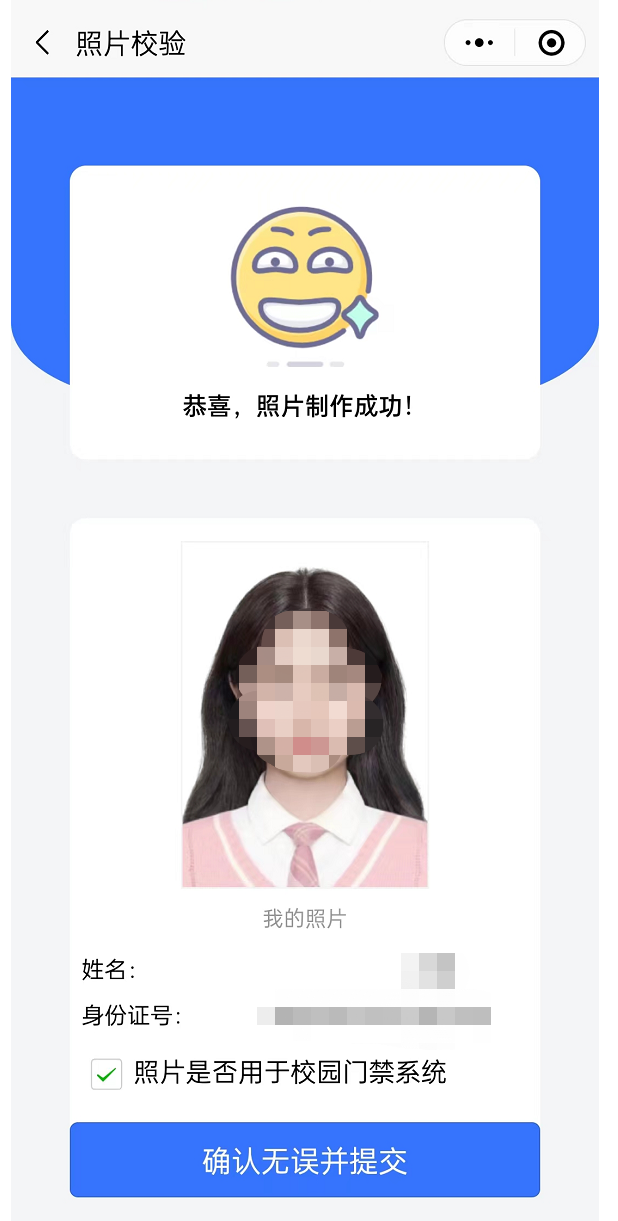 在照片预览页面点击【下一步】跳转到照片校验页面,默认是勾选照片用于校园门禁系统,如果不想用与门禁系统可以选择取消,核对个人信息是否正常,点击【确认无误并提交】将系统提到系统中,等待相关人员审核