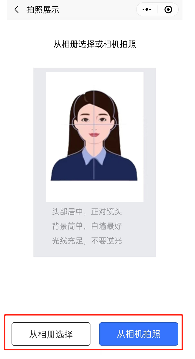 选择用相机拍摄,打开本机的拍照功能,默认打开后置摄像头;可以通过右下角的切换按钮切换为前置摄像头进行拍照,拍照后生成要提交的证件照,如果对制作的照片不满意可以选择【重新制作】