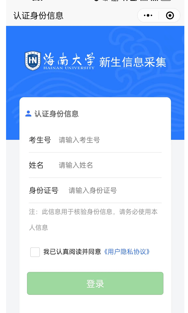 扫码进入照片采集小程序后在系统开放时间段内通过填写考生号、姓名、身份证号并勾选同意【用户隐私协议】登录照片采集系统