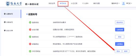 PC端更换手机号:个人中心-账号安全-解绑