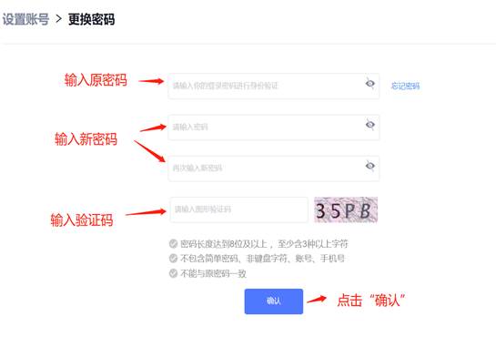 输入原密码和新密码,输入验证码,点击“确认”按钮即可