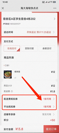 备注:红色框框内显示有可用优惠券,一定要点进去勾选对应的优惠券使用。