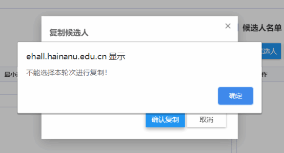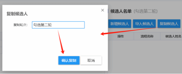 复制候选人时,点击专家列表上方的“复制候选人”按钮打开候选人复制窗口,然后选择所需要复制的轮次,最后点击“确认复制”按钮即可完成候选人的复制,复制成后可根据需要在候选人列表中进行专家信息的删除。