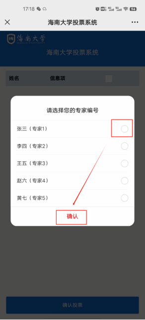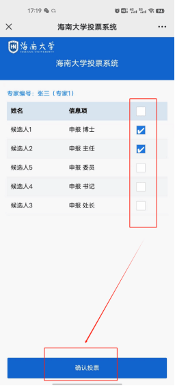 选择专家编号后会进入候选人的投票界面,根据配置进行候选人的勾选,符合配置规则后点击“确认投票”按钮即可完成投票。
