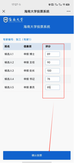 选择专家编号后会进入候选人的投票界面,专家需要对所有人进行打分,符合配置规则后点击“确认投票”按钮即可完成投票。