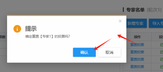 专家投票后,如果需要重新投票时管理人员可进行投票的重置,点击专家列表中的“重置投票”按钮即可进行重置投票操作,在提示中点击确认即可完成目标专家的投票重置,该专家的投票状态也会跟着变成未投票。