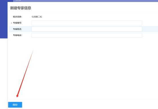 手动添加专家时,点击投票轮次列表中的“专家”链接可生成该轮次的专家列表,点击“新增专家”按钮打开添加专家的窗口,填写完专家信息后点击“保存”即可完成专家信息的添加。