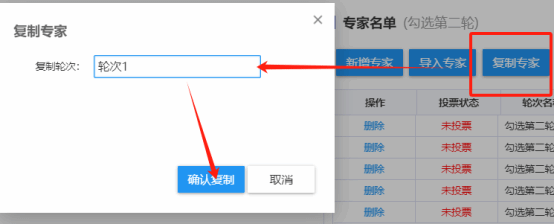 复制专家时,点击专家列表上方的“复制专家”按钮打开专家复制窗口,然后选择所需要复制的轮次,最后点击“确认复制”按钮即可完成专家的复制,复制成后可根据需要在专家列表中进行专家信息的删除。
