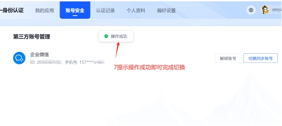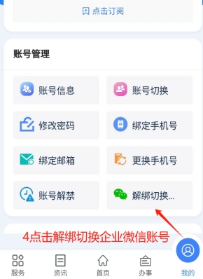 (2)解绑企业微信账号:返回访问【我的】→点击【解绑切换企业微信账号】→5点击【企业微信】