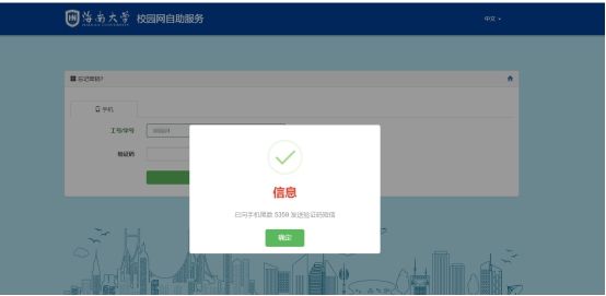 1.如果忘记上网账号密码,可在认证页面下点击“忘记密码” 进行密码找回,如下图,输入工号/学号,点击“获取验证码”,验证码将发送到系统预留的手机号码上,输入验证码确认后即可重置账号密码。